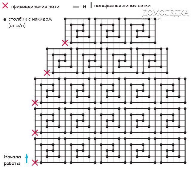 1-й р.: присоединить нить к нижнему левому углу основного полотна (Х на схеме), 3 возд. п., *[2 ст с/н в каждые 4 поперечные линии сетки, 1 ст с/н в след. п., повернуть работу на 90◦ против часовой стрелки] вязать дважды (в квадратных скобках), 2 ст с/н в каждые 3 поперечные линии сетки, 1 ст с/н в след. п., повернуть работу на 90◦ против часовой стрелки, 2 ст с/н в след. 2 поперечные линии сетки, 1 ст с/н в след. п., [повернуть работу на 90◦ против часовой стрелки, 2 ст с/н в след. поперечную линию сетки, 1 ст с/н в след. п.] вязать дважды, повернуть работу на 90◦ по часовой стрелке, 2 ст с/н в каждые 2 поперечные линии сетки, 1 ст с/н в след. п., повернуть работу на 90◦ по часовой стрелке, 2 ст с/н в каждые 3 поперечные линии сетки, 1 ст с/н в след. п., повернуть работу на 90◦ почасовой стрелке, 2 ст с/н в каждые 4 поперечные линии сетки, 1 ст с/н в след. п., повернуть работу на 90◦ по часовой стрелке, 1 ст с/н в след. п.; повторить от * еще 4 раза, затем 2 ст с/н в каждые 4 поперечные линии сетки, 1 ст с/н в след. п. Отрезать нить, закончить ряд.