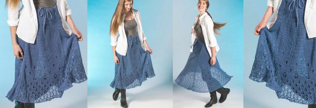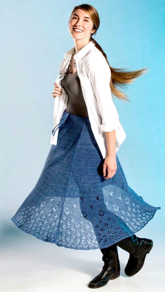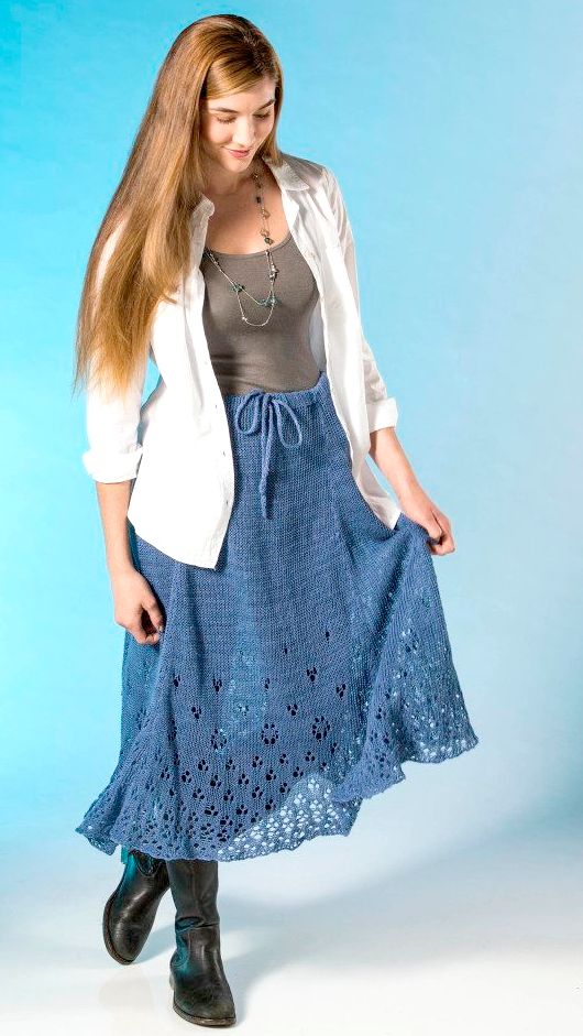 Летняя вязаная юбка Eyelet выполнена спицами несложным ажурным узором на подоле. Такая вязаная юбка подходит для любого типа фигуры. Эта модель может быть первой работой для неопытных вязальщиц, так как узор выполняется только в рядах лицевой стороны. Подогнать объем талии очень легко, используя шнур или резиновую тесьму.