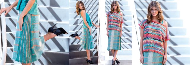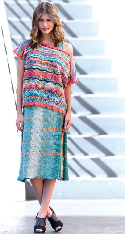 Летняя юбка цвета морской пены и яркий долман вязаный узором из шевронов, приближают долгожданное лето на коралловых островах. Дизайнер Laura Bryant.