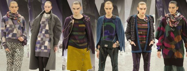 Главный стилист Дома Chanel Карл Лагерфельд бережно сохраняет уникальность стиля в духе великой Мадам, вкладывая в него новую жизнь и современные тенденции. В коллекции Automne-hiver 2012-2013 трикотажные изделия выполнены с эффектом лоскутного вязания.