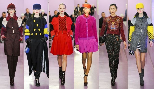 Главная мысль новой коллекции KENZO: осень - время буйства красок. Преобладают сочные, насыщенные оттенки бордового, синего, желтого и красного. Подобно природе, которая смешивает материалы и краски, не признавая правил, арт-директор дома KENZO дизайнер Антонио Маррас намерено усиливает пестроту узоров, соединяя различные рисунки. Оригинальное решение - рукава и воротники пальто связаны из пряжи контрастных цветов.