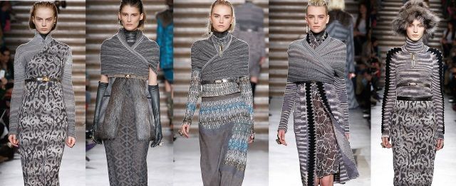 Каждая коллекция Missoni- значимое событие для любителей трикотажа и дефиле сезона 2012-2013 не стало исключением. Анжела Миссони следует традициям своей марки, но каждый год добавляет какую-то "изюминку". В этот раз главным трендом стали трикотажные пелерины в полоску. Они участвовали в создании рафинированных линий и пропорций, вытянутого, утонченного и элегантного силуэта. Цветовая палитра коллекции гармоничная и спокойная, выраженная в жемчужно-серой гамме и в оттенках от светло бежевого до золотисто-коричневого. Анжела Миссони в течение последних лет старается, чтобы узор "зигзаг" скорее напоминал подпись художника, но не был самой картиной.