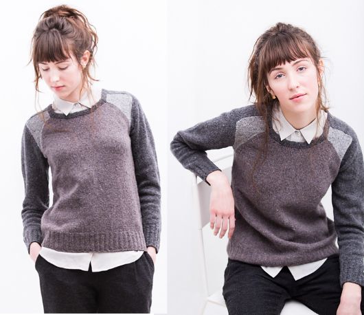 Модный вязаный пуловер League спортивного стиля из цветовых блоков. Перед и спинка связаны спицами в технике интарсии, создающем эффект реглана и погон на плечах, переходящих в рукава. Слегка расширенный силуэт пуловера позволяет носить его поверх блузки с отложным воротником рубашечного кроя.