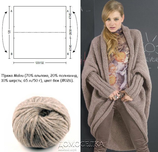 Простая объемная накидка для женщины с рукавами связана спицами лицевой гладью.