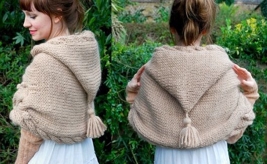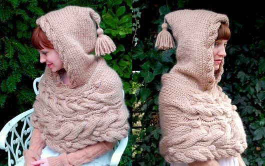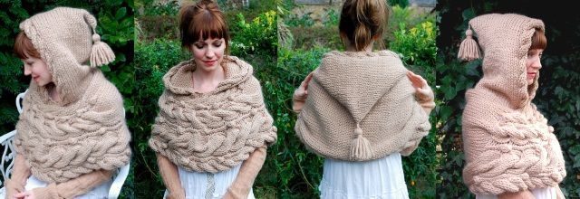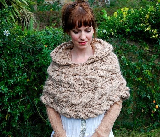 Теплая вязаная накидка с капюшоном Woodland Hoodlet от Stephanie Dosen выполняется спицами из объемной пряжи узором из кос.