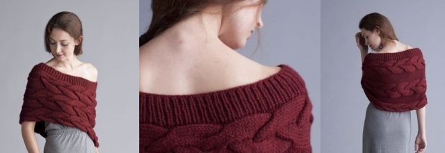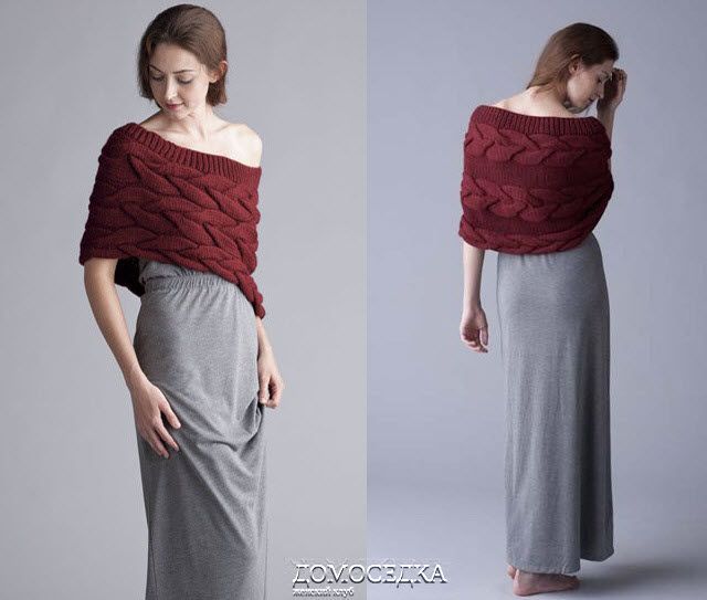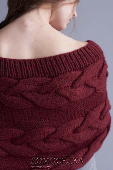 Шикарная вязаная накидка с косами выполнена спицами в поперечном направлении.