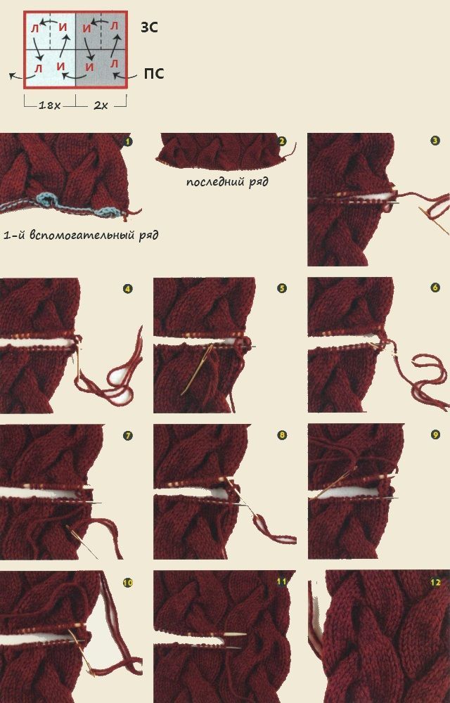 Взять другие круговые спицы и набрать нитью "хвоста" 1 п. в начале наборного ряда (1). Затем перенести на спицы 60 п. наборного ряда, удаляя вспомогательную нить = 61 п (2). Расположить спицу с 61 п. позади (ЗС), а спицу с 60 п. последнего ряда - впереди (ПС). Нить "хвоста" вдеть в иглу и петли с обеих спиц следующим образом: