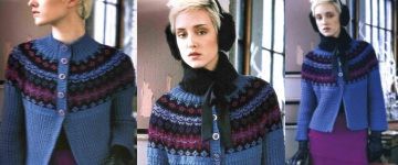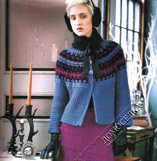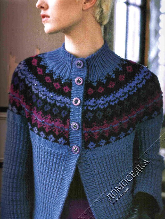 Норвежская кофта с круглой кокеткой от Ники Эпштейн связана спицами красивым жаккардовым узором и украшена бисером.