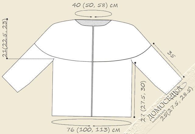 Объединительный р. (ИС): 37 (43, 49) изн. (петли левой стороы переда), 43 (47, 51) изн. (петли 1-го рукава), 75 (87, 101) изн. (петли спинки), 43 (47, 51) изн. (петли второго рукава), 37 (43, 49) изн. (петли правой стороны переда) = 235 (267, 301) п. кокетки.