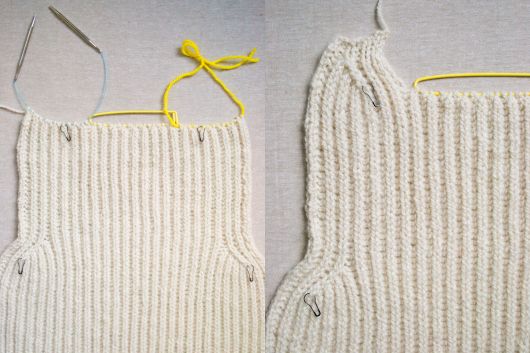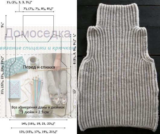 Начать и вязать как перед. Выполнить пройму = 43 (47, 51, 55) петли. Далее вязать прямо, пока высота проймы не составит 20 (21.5, 23, 24, 24) см, закончить в изнаночном ряду.