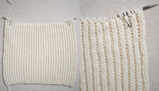 Плотность вязания резинкой Бриошь: 4 петли и 5 рядов = 2.5 см спицами большего размера.