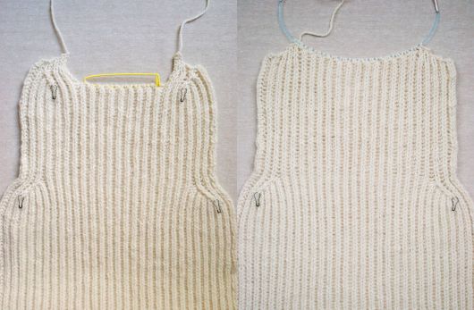 далее вязать 29 (29, 29, 33, 33) петель горловины спинки следующим образом: *снять 1 петлю как изнаночную (нить перед работой), лицевой накид, 2 петли вместе лицевой; повторять от * до последней петли, снять 1 петлю как изнаночную (нить впереди), лицевой накид = 64 (64, 64, 72, 72) петли в итоге.