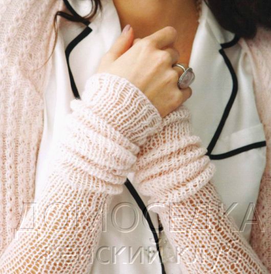 Болеро вяжется одним полотном: от левого рукава круговыми рядами, затем выполняется спинка прямыми рядами и далее вяжется правый рукав снова круговыми рядами.