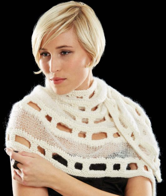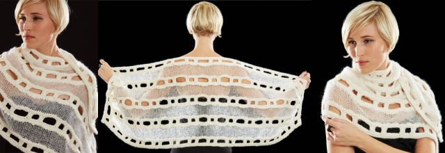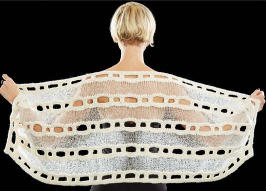 Белый вязаный палантин из мохера от Карнелии Гамельтон выполнятся спицами оригинальным узором с прямоугольными и квадратными отверстиями.