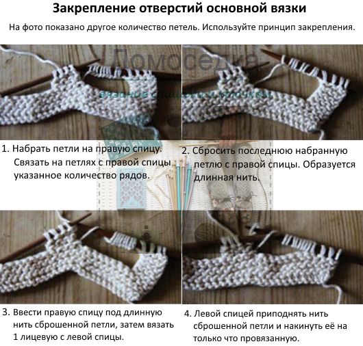*Ввести правую спицу под нить сброшенной петли, затем вязать 1 лицевую с левой спицы и накинуть нить сброшенной петли на только что провязанную. Довязать лицевыми 2 оставшиеся петли подъема. Повернуть и связать 1 ряд только на 3-х петлях. Повернуть. Повторить ряд закрепления от * еще раз. Набрать 4 петли.
