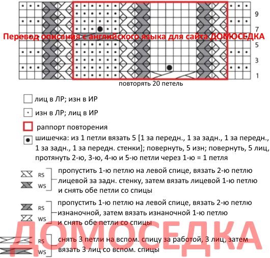 Плотность вязания образца = 26.5 петель и 20.5 рядов = 10 см основным узором.