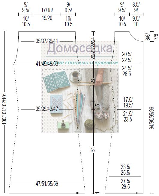Формирование V-выреза горловины: на высоте 94 (95/95/96) см от начала работы, закрывать с правой стороны в каждом 2-м ряду по 5 петель 1 раз (по 7 петель 1 раз/по 8 петель 1 раз/по 9 петель 1 раз), затем по 3 петли 1 раз, по 2 петли 2 раза и по 1 петле 3 раза.