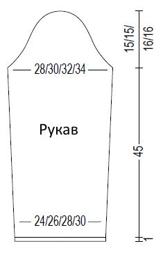 Через 46 см от начала работы, закрыть с обеих сторон для оката рукава в каждом 2-м ряду по 2 петли 1 раз (по 2петли 1 раз/по 2 петли 2 раза/по 2 петли 2 раза), затем убавить по 1 петле 8 (8/9/9) раз, затем в каждом 4-м ряду по 1 петле 4 раза, затем снова в каждом 2-м ряду закрыть по 2 петли 1 раз и по 3 петли 1 раз. Когда высота оката рукава составит 15 (15/16/16) см, свободно закрыть оставшиеся петли.
