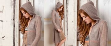 Легкое вязаное пальто с капюшоном выполнено спицами из мохера.