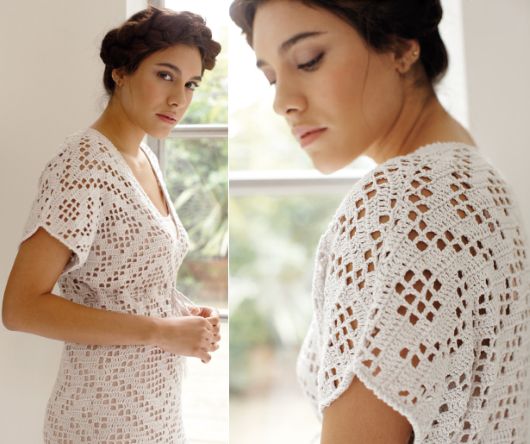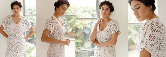 Ажурная модель Pania, связанная крючком филейной вязкой, представлена в двух варианта: один из них – топ с треугольным вырезом горловины и цельновязаными рукавами, а второй вариант – роскошное длинное платье с высоким разрезом сбоку.