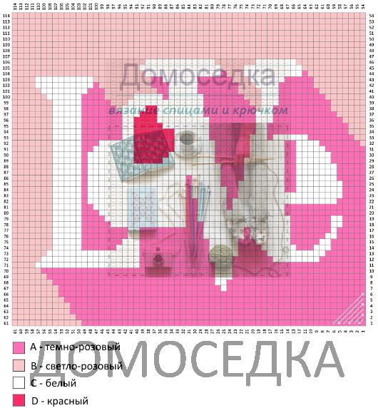 Для вязания потребуется: пряжа Super Saver – по 1мотку каждого цвета: темно-розового (А), светло-розового (В), белого (С) и красного (D); крючок 6 мм.