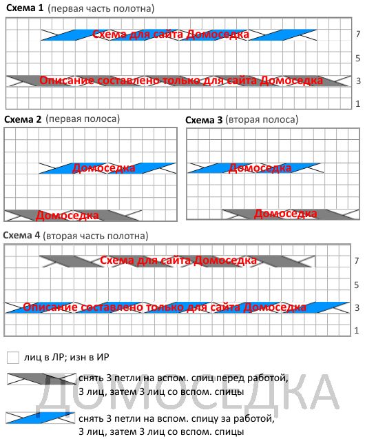 Далее вязать первую полосу по схеме 2 и повторить 8 рядов 3 раза. Перенести петли на второй держатель.