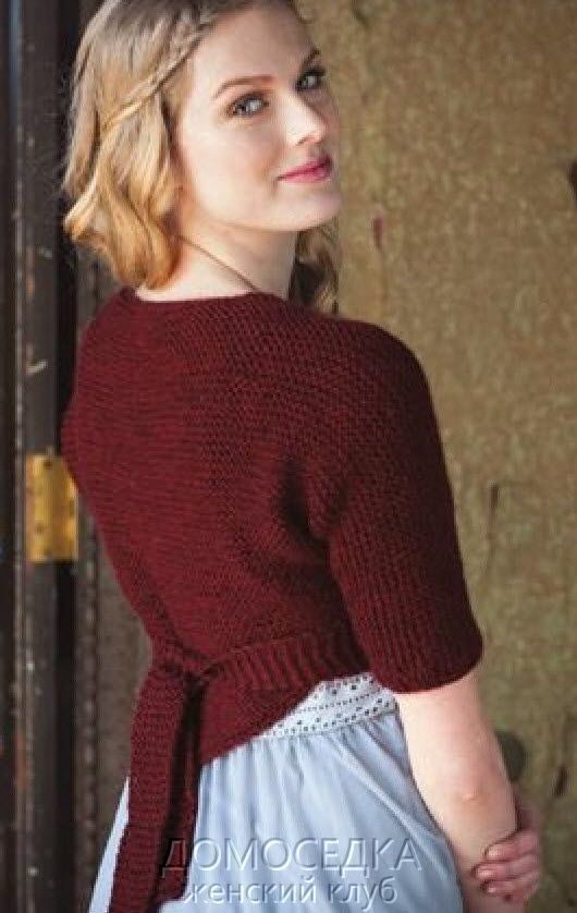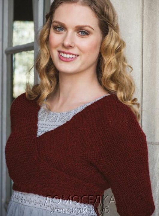 Миленькое простое болеро с запахом связано спицами платочной вязкой. Дизайнер JoanofDark. Работа не требует особого умения.