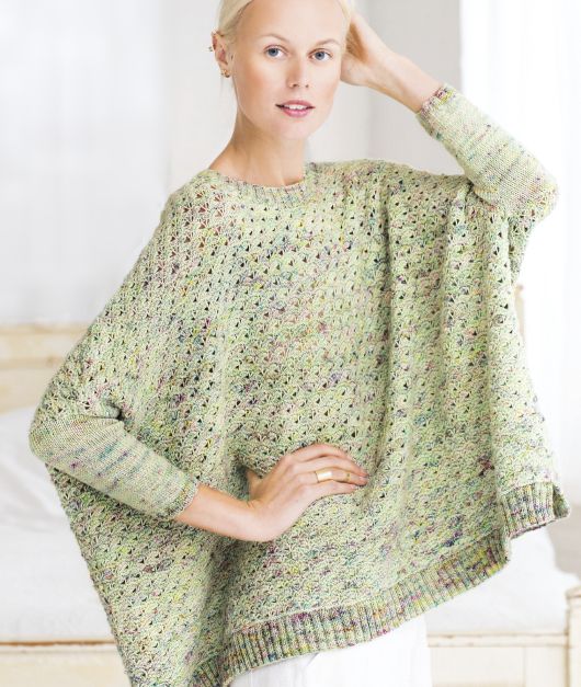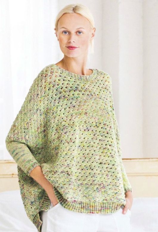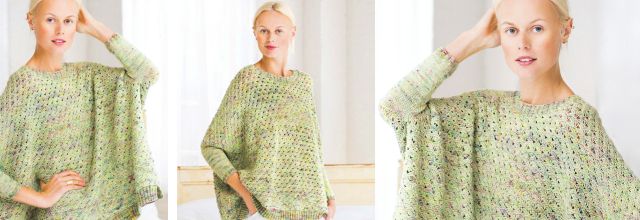 Вязаный спицами, свободный пуловер в стиле пончо с узкими рукавами и разрезами с боковых сторон. Спинка и перед вяжутся отдельно узором «морская пена», затем лицевой гладью вяжутся рукава. Манжеты и горловина пуловера обвязаны резинкой. Модель из журнала Vogue Knitting весна 2017.