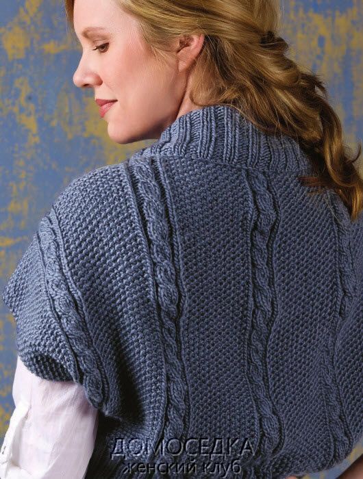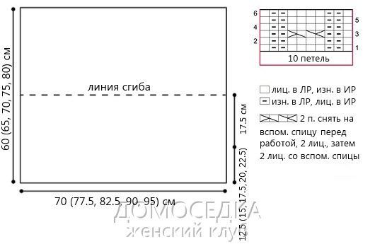 Вязать как установлено, пока полотно не достигнет 50 (55, 60, 65, 70) см. Закончить в изнаночном ряду. Связать резинкой 2х2 еще 10 см и закрыть петли по рисунку.