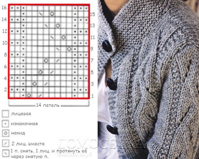 Связать еще 2 ряда по рисунку. Продолжить и убавить в конце след. ряда 1 п., затем в каждом 12-м ряду еще 4 раза = 30 (33, 35, 38) п. Одновременно, на высоте 20 см от начала работы, выполнить петлю для пуговицы в лицевом ряду следующим образом: 2 лиц., закрыть 2 п. В след. ряду набрать 2 п. вместо закрытых петель. Остальные петли выполнить в соответствии с отметками на левой стороне переда.