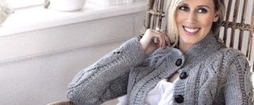 Спинка кофты связана лицевой гладью; передние стороны и рукава выполнены ажурным узором, который имитирует косы; планки, манжеты и ворот связаны платочной вязкой.