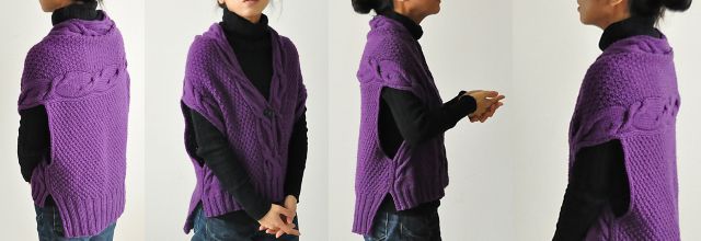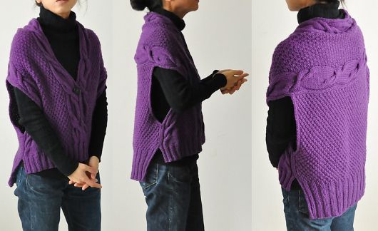 Стильная вязаная накидка выполнена спицами узором Мох и витыми косами. Удлиненная спинки и разрезы в боковых швах – модные детали. Накидка отлично подойдет для прохладных вечеров в любое время года.
