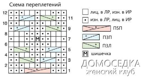 П5П = снять 3 петли на вспом. спицу за работой, 2 лиц., затем вязать со вспом. спицы 1 изн., 2 лиц.