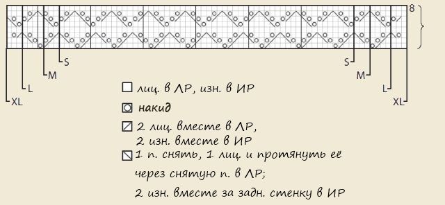 4-й р. (ЛС): 1 лиц. *накид, 1 п. снять, 1 лиц. и протянуть её через снятую п., 5 лиц.; повторять от * до послед. п.: 1 лиц.;