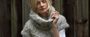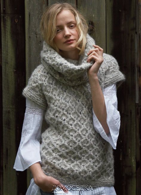 Теплая вязаная безрукавка с большим воротником от дизайнера Лизы Ричардсон связана спицами нитью в два сложения.