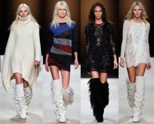 Молодым девушкам и стройным, худеньким женщинам подойдут маленькие вязаные платья, похожие на туники. Понятно, что великолепно выглядеть в подобных одеяниях смогут только обладательницы идеальных пропорций и точеных ног – именно им адресовали свою продукцию такие широкодоступные бренды как, например, Victoria's Secret.