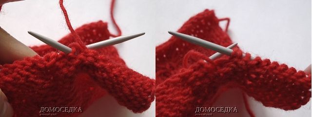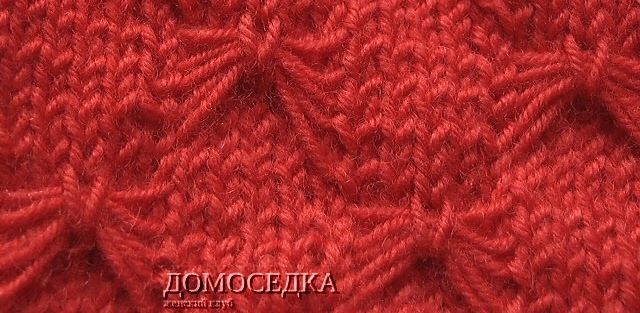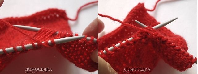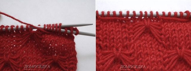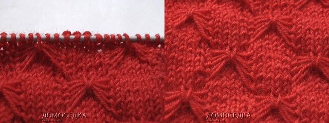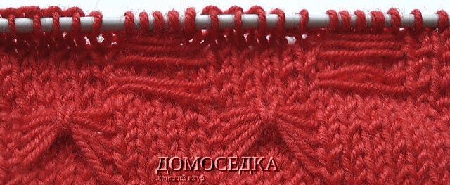 3. в 10-м изнаночном ряду выполнять по схеме "бабочек" следующим образом: правой спицей собрать с лицевой стороны 5 протяжек и перевести их на левую спицу,