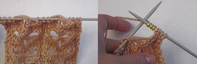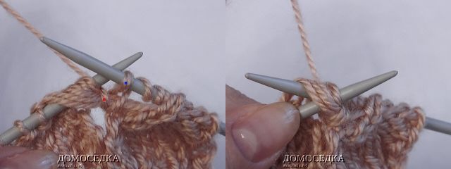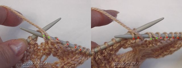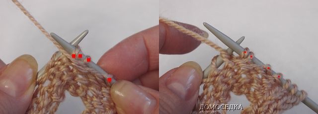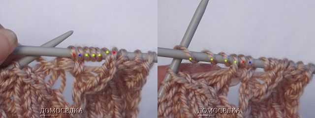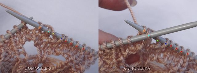 7. в 7-ом лицевом ряду петли будут выглядеть как на рисунке; далее набрать по схеме 4 петли (можно из накидов);