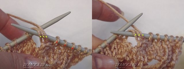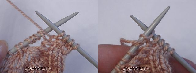 4. в изнаночном ряду 2 петли вместе скрещенные вязать за заднюю стенку, чтобы с лицевой стороны сохранить наклон влево;