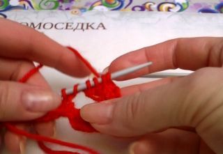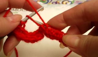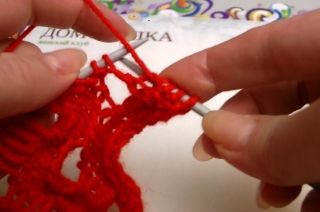 Присоединение 2-й перемычки (лицевая сторона): кром., 3 лиц., 1 накид, 4 лиц. от основного полотна.
