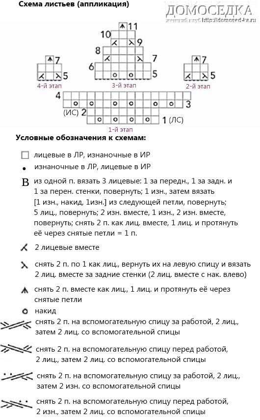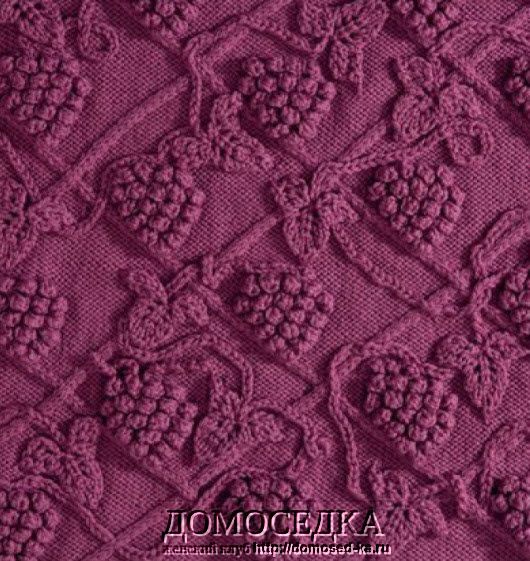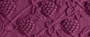 Очень красивый узор из коллекции от Melissa Leapman выполнен спицами в два этапа: сначала вяжется основное полотно из решетки и гроздьев винограда, затем отдельно выполняются листья и пришиваются к основному полотну длинными цепочками.