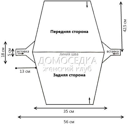 Сшить полотна передней и задней стороны (по закрытым петлям). Пришить вставки по боковым сторонам (см. схему), затем выполнить боковые швы.