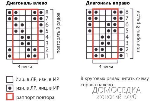 Установочный круг: вязать резинкой 66 петель по схеме диагональ вправо, ПМ (поместить маркер), затем 6 петель резинкой 2х2, ПМ, далее вязать резиной 138 петель (спинка) по схеме диагональ влево, ПМ, затем 37 петель резинкой 3х1, ПМ, далее 8 петель резинкой 2х2, ПМ, затем 37 петель резинкой 3х1 (всего 82 п. для переда).