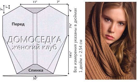 Повторять 1-7 ряды пока не будут выполнены 180 рядов вдоль укороченной стороны. Закрыть петли. Выполнить шов. Пришить воротник к горловине (шов в центре спинки).