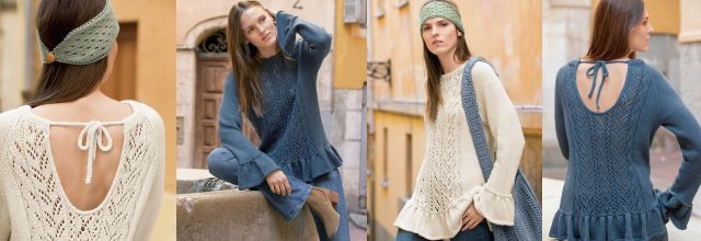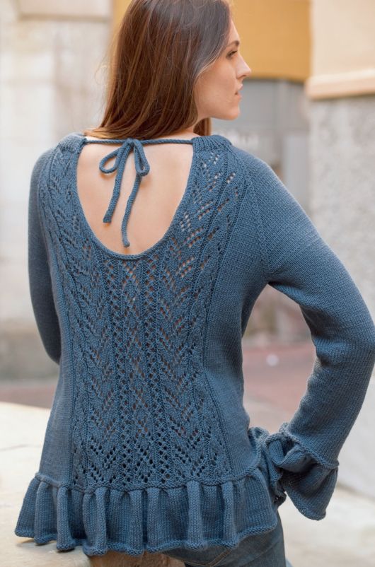 Вязаная блуза Donna в стиле бохо с оборками и ажурными панелями выполняется снизу вверх по кругу.
