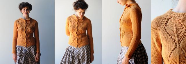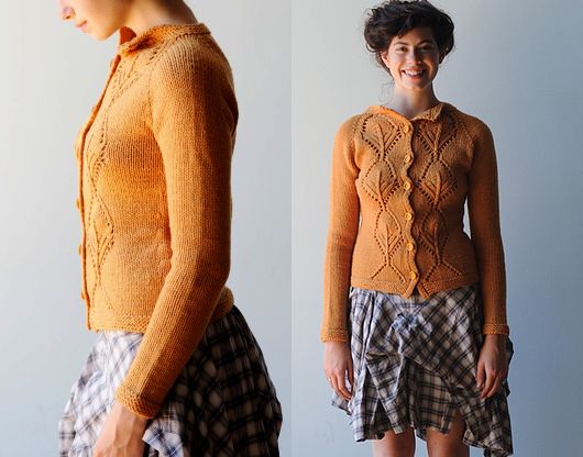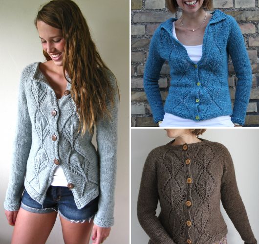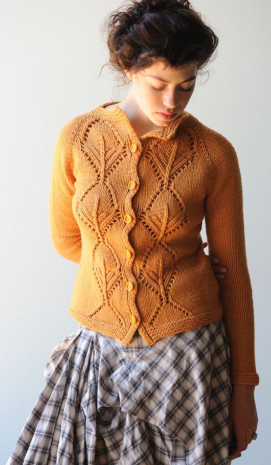Симпатичная вязаная кофта Anastasia с рукавами реглан и крупным узором из листьев, выполнена спицами сверху вниз. Сначала выполняется бейка горловины платочной вязкой и резинкой. Передние планки вяжутся вместе с основным полотном. Далее формируется реглан и панели с листьями на полочках.