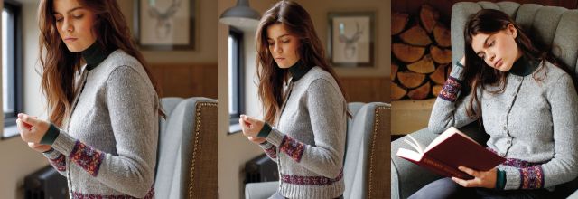 Уютная классика – вязаная кофта Helvellyn на пуговицах с круглым вырезом горловины и длинными вшивными рукавами. Она выполнена лицевой гладью из однотонной пряжи с отделкой жаккардовым узором на манжетах и по низу полочек и спинки.