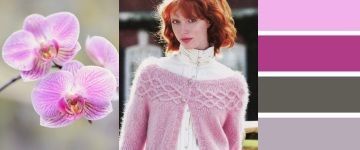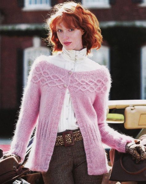 Нежная и тонкая вязаная кофта из мохера выполнена спицами единым полотном и украшена кокеткой с витым узором.