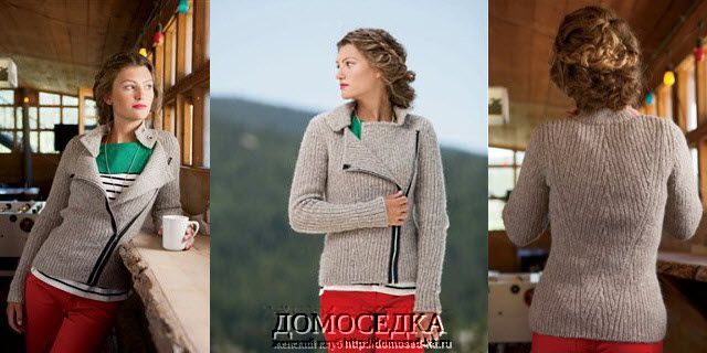Жакет вяжется сначала одним полотном на длинных круговых спицах. Затем полотно разделяется на передние стороны и спинку. После выполняются рукава и воротник.
