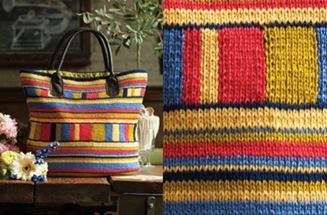 Для вязания потребуется: по 2 мотка пряжи Classic Elite Yarns (100% мерсеризированный хлопок, 93 м/50 г) пяти цветов: темно-синего (А), желтого (В), красного (С), зеленого (D), голубого (F); круговые спицы 4 мм длиной 80 см, дополнительная спица 4 мм (для закрывания петель); две готовые ручки 61 см длиной; отрезок ткани для подкладки; кусок картона для основания.